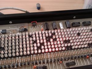 - Je ein 3349DC des gesockelten Paars je LED-Platine ist für die oberen/unteren 4 Zeilen zuständig, entfernt man einen, dann bleiben die 3 Zeilen LEDs auf entsprechender Seite ausgeschaltet. Die mittlere der sieben LED-Zeilen wird von beiden Chips bedient.