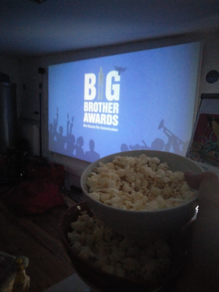 | Beschreibung | English: Impression des public Streaming der Big Brother Awards 2019. Hier gezeigt frisches Popcorn mit Leinwand im Hintergrund. |