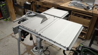 Beschreibung Festool CMS Zubehör: CMS-GE mit Tischverbreiterung VB, Tischverlängerung VL und Schiebetisch ST. Im Tisch eingebaut ist der Modulträger CMS-TS 55 und die Tauchkreissäge TS 75.