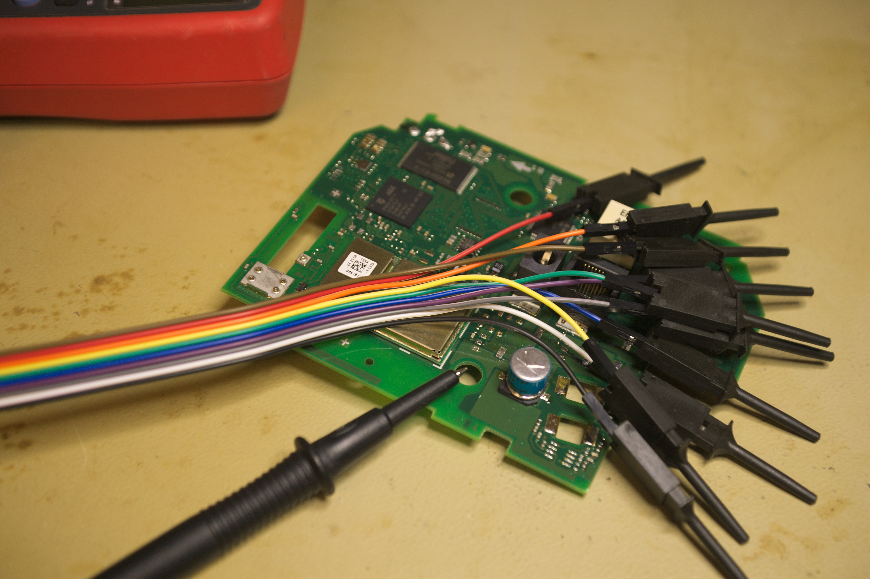 | Beschreibung | Regenbogenfarbene Kabelpeitsche des USBee AX Pro, eine Messspitze des LeCroy 9304A und random Hardware auf dem Arbeitsplatz in der Lötecke im Frickelraum |